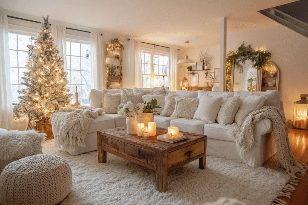 Use pillow covers so you can wash them fast. Choose battery candles if you have pets or kids. Put extra blankets in baskets. If your living room is small, use a smaller tree. If your pets eat tinsel, skip it. Trust me, skip it.