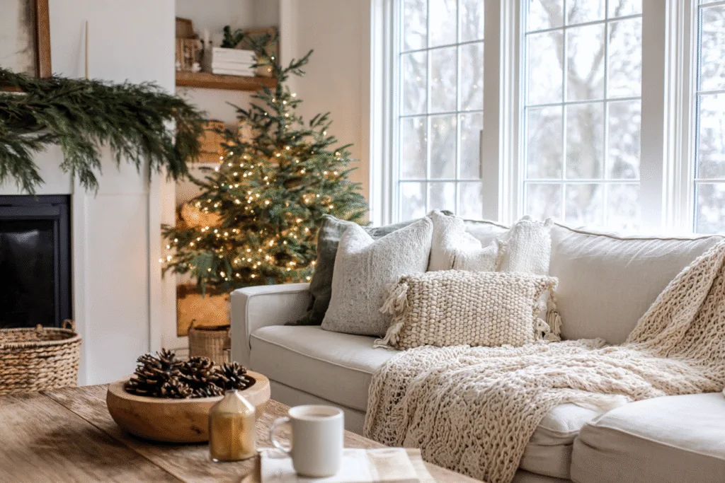 So: start by decluttering the usual holiday explosion. Keep surfaces clean. Then introduce one or two well-chosen elements (a knit throw, a bowl of pinecones, one elegant wreath) that speak “holiday” without shouting.